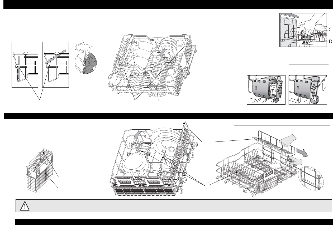 - Open the two retainers (D) to take off the upper rack (when the upper rack is in